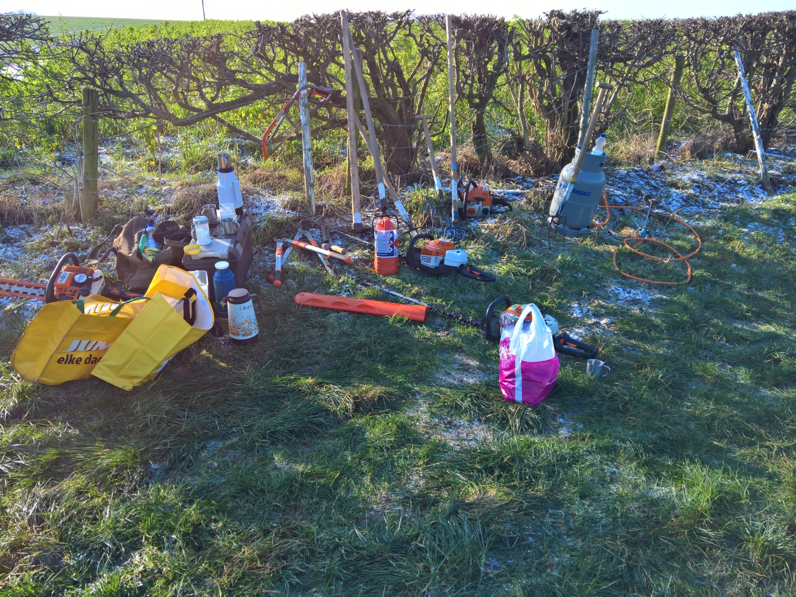 De werkgroep verzorging (een groep dames) voorziet de werkers en werksters in het veld, zoals hier de werkgroep 1ste Zaterdag van de Maand, van een broodje en een kop koffie.